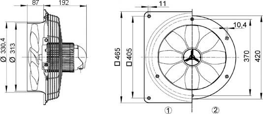 - Axial-Wandventilator mit Stahlwandring, in Wechselstromausführung.
