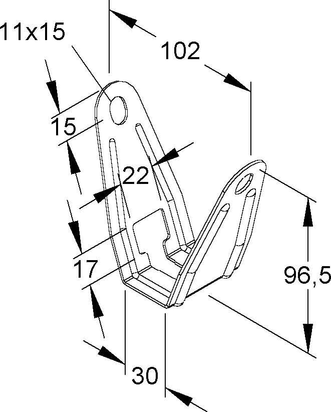 . Tragfähigkeit : 1 kN Abmessungen (ca. Maße) Höhe H : 96,5 mm Breite C (innen) : 30 mm Öffnungsmaß A : 102 mm Befestigungslochung D : 11 x 15 mm Werkstoff : Stahl, bandverzinkt nach DIN EN 10346