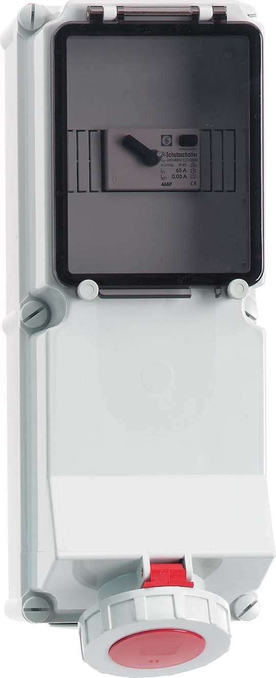 Sonstige technische Eigenschaften: Die Leitungseinführung ist einmal oben und zweimal unten offen, Mit eingebautem Fi Schutzschalter 125/0,5A 4pol