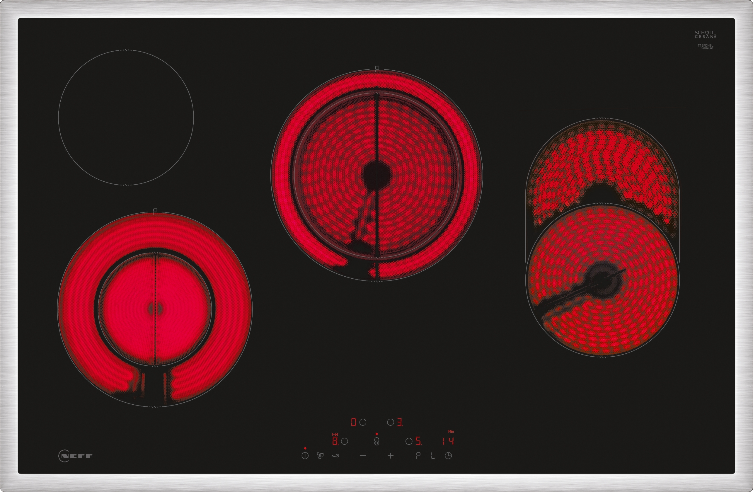 80 cm: Platz für 4 Töpfe oder Pfannen Flexibilität der Kochzonen Bräterzone: Extra zuschaltbare Kochzone für großes Bratgeschirr Zweikreis-Kochzone: Verwenden Sie normales oder größeres Kochgeschirr für die erweiterbare Kochzone. Kochzone vorne links: 120 mm, 210 mm, 0.8 kW (maximale Leistung 2.6 kW) Kochzone hinten links: 145 mm, 1.2 kW Kochzone hinten: 180 mm, 230 mm, 1.7 kW (max. Leistung 3.4 kW) Kochzone vorne rechts: 170 mm, 265 mm, 1.8 kW Benutzerfreundlichkeit Touch Control: Steuern Sie die Leistung mit den aufgedruckten +/- Touch-Tasten. 17 Leistungsstufen: Stellen Sie die Hitze mit 17 Leistungsstufen (9 Hauptstufen und 8 Zwischenstufen) präzise ein. Warmhaltefunktion für alle Kochzonen: Halten Sie das aufgesetzte Geschirr bei voreingestellter niedriger Leistung warm. Switch Off Timer: schaltet die Kochzone am Ende der eingestellten Zeit aus (z. B. für gekochte Eier). Countdown-Timer Wecker: Ein Signal ertönt am Ende der eingestellten Zeit (z. B. beim Pastakochen). Zeitersparnis und Effizienz Powerstufe: Vorne links, Hinten mitte - Bringt Wasser, dank 20 % mehr Energiezufuhr, schneller zum Kochen als auf höchster Normalstufe. Restart Funktion: Im Falle von unbeabsichtigtem Ausschalten des Kochfeldes bleiben alle Einstellungen erhalten, wenn Sie innerhalb von 4 Sekunden wieder einschalten. Schnelles Abschalten: Schnelles Abschalten durch längeres Berühren der Bedienfläche der Kochzone. Design Rahmen in Edelstahl Sicherheit 2-stufige Restwärmeanzeige je Kochzone: Zeigt an welche Kochzonen noch heiß oder warm sind. Kindersicherung: Verhindert eine unbeabsichtigte Aktivierung des Kochfeldes. Wischschutzfunktion: Übergekochte Flüssigkeiten abwischen, ohne die Einstellungen unbeabsichtigt zu ändern (30 Sekunden sind alle Touch-Tasten blockiert). Hauptschalter: Alle Kochzonen auf einmal ausschalten. Betriebsanzeigelampe: Zeigt an, ob das Kochfeld heizt. Automatische Sicherheitsabschaltung: Aus Sicherheitsgründen schaltet das Kochfeld nach einer voreingestellten Zeit ohne Interaktion automatisch ab (einstellbar). Energieverbrauchsanzeige: zeigt den Stromverbrauch des letzten Kochvorgangs an. Installation Maße des Gerätes (HxBxT mm): 48 x 795 x 517 Erforderliche Nischengröße (HxBxT mm): 48 x 780 x (500 - 500) Minimale Arbeitsplattenstärke: 16 mm Gesamtanschlusswert: 9300 W