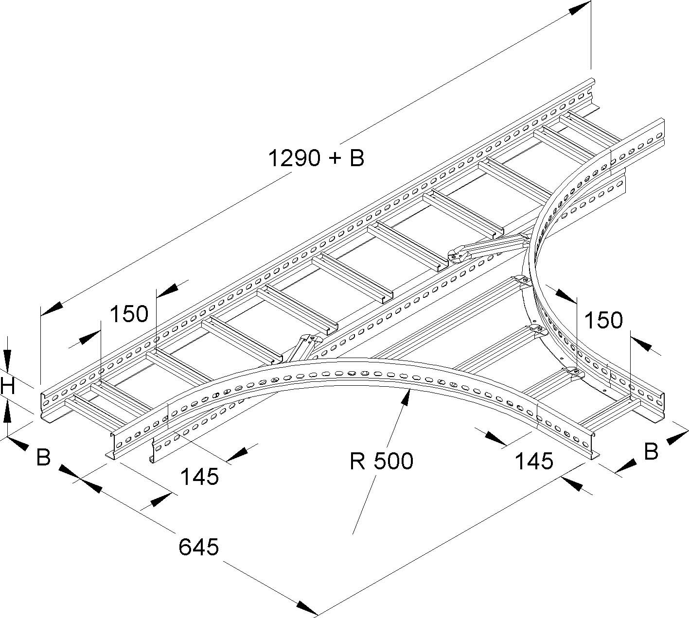 T-Stück, mit durchgehend perforierten und profilierten Seitenholmen, mit eingenieteten Sprossen aus C-Profilen mit 16 mm Schlitzweite, zur Herstellung von horizontalen 90° T-Abgängen. Stoßstellenverbinder KLVB 60/4 bitte separat bestellen. Passende Bügelschellen (B...). Zur Verwendung im Funktionserhalt bitte Zusatzvorschriften beachten! für Kabelleiter : KL 60.315 Abmessungen (ca. Maße) H x B : 60 x 300 mm Länge in Hauptrichtung : 1290 mm + B Länge in Abgangsrichtung : 645 mm + B Innenholmradius R : 500 mm Werkstoff : Stahl, bandverzinkt nach DIN EN 10346