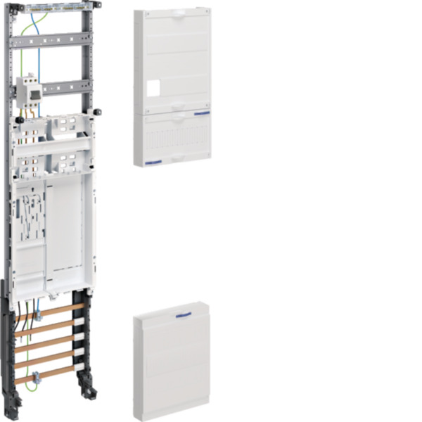 Zusatzraum: 1-feldig, Höhe 150 mm, mit Abdeckung geschlossen, Vorprägungen für 12 PLE, plombierbar, mit Hutschiene 12 PLE, Öffnungen für Leitungsführung.