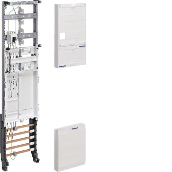 Zusatzraum: 1-feldig, Höhe 150 mm, mit Abdeckung geschlossen, Vorprägungen für 12 PLE, plombierbar, mit Hutschiene 12 PLE, Öffnungen für Leitungsführung.