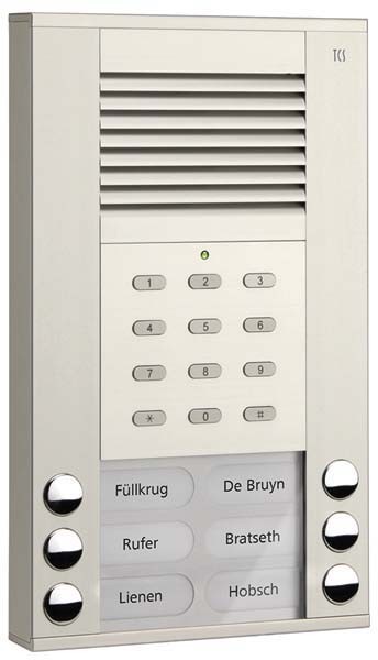 für bis zu 6 Wohneinheiten, Aufputzmontage, Produkttiefe 20 mm, Metallgehäuse aus robusten Aluminiumprofilen, Metallklingelknöpfe mit vergoldeten, wartungsfreien Kontakten, jeder Klingeltaste können 2 Innenstationen zugeordnet werden, langlebige und energiesparende Namensschildbeleuchtung, bruchsicheres Namensschildglas, Quittungston beim Drücken der Klingeltaste, PES-Funktion einstellbar mit Konfigurationssoftware configo (außer Klingeltastenprogrammierung), Gesprächszeit ab Werk: 56 Sekunden / mit Servicegerät einstellbar, beliebige Klingeltaste zum Lichteinschalten nutzbar, Lautstärke und Mikrofonempfindlichkeit sind manuell einstellbar, steckbarer Speicher zum Austausch baugleicher Außenstationen, R-Klemme zum Anschluss einer Funktionserweiterung - Türöffnen, Türöffnerzeit an R-Klemme ab Werk: 3 Sekunden / mit Servicegerät einstellbar, Türbereitschaftszeit (zur Steuerung der Kurzzeitspeicherung in Innenstationen) ab Werk: 56 Sekunden / mit Servicegerät einstellbar, Sprechverbindung in der Türbereitschaftszeit / mit Servicegerät einstellbar, Material / Farben: Aluminium eloxiert natur (EN), Schutzart IP44, Eingangsstrom (3-Draht-Technik) I(a) = 0,6 mA, I(P) = 20 mA, Maximaler Eingangsstrom I(Pmax) = 80 mA, Maße: H von 223 mm x B 135 mm x T 20 mm, Zulässige Umgebungstemperatur -25 Grad C bis +55 Grad C, Codeschloss-Eigenschaften, 10 Zugangscodes (max. 8-stellig) mit individuellen Auslösefunktionen, Senden von TCS-Protokollen Türöffner, Steuerfunktion, ein Mastercode (max. 8-stellig) zur Wartung und Konfiguration, Programmierung manuell, Akzeptanz führender Nullen in Zugangscodes, Eingabe Zugangscode ohne Abschluss durch # -Taste, Lichtschaltprotokoll senden bei Drücken der # -Taste, LED zur Statusanzeige, optische und akustische Quittung bei Codeeingabe, Optische und akustische Fehlersignalisierung, Akustische Tastenquittierung, Schalteingang, zweipolige steckbare Schraubklemme für externen potentialfreien Kontakt, der Schalteingang ist konfigurierbar und beeinflusst die Wirksamkeit des Codes auf Speicherplatz Nr.1 (Codeabstell- bzw. Briefträgerfunktion), Erweiterungsbuchse zum Anschluss der Klingeltastenerweiterung oder des Servicegerätes, Material, Farbe Tastaturraum: Aluminium eloxiert natur, Höhe Codeschloss 76mm