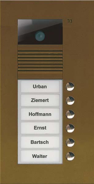 Single-chip CMOS, diagonaler Erfassungswinkel: 130 Grad, Auflösung, maximal (Pixel x Pixel): PAL: 648 H x 488 V, Auflösung: 380 H TVL Color, Objektiv 2,0 mm , F=2,5, Lichtempfindlichkeit: 1,0 lx (F 1,2), Videoausgangssignal: (differenziell, koaxial) 1,1 Vp-p., Geräteeigenschaften, Video-Außenstation, Anzahl Klingeltasten: 6, Montageform: Unterputzmontage, Gehäuseform: Frontplatte mit Unterputzkasten, Material Gehäuse: Aluminium, Farbe Gehäuse: eloxiert bronze, Material Klingeltasten: Metall mit wartungsfreien , Kontakten, bruchsicheres Namenschildglas, energiersparende LED-Namensschildbeleuchtung, Öffnungsprinzip: win:clip, Lautstärke Sprachausgabe: einstellbar, Lautstärke Mikrofonempfindlichkeit: einstellbar, Erweiterte Eigenschaften, Lichtschaltfunktion: an jeder Klingeltaste, Namens-/Informationsfeld: weiß hinterleuchtet, Anzahl Drähte: 6-Draht notwendig , Installationsmix Audio, Video, Zutritt in einer Anlage: möglich, Konfigurationsmöglichkeiten: manuell, mit Servicegerät, mit Konfigurationssoftware , Speicher Anlagenkonfiguration: tauschbar gesteckt, Technische Daten, Technologie: 2-Draht-TCS:BUS, Stromaufnahme, in Ruhe: 140 mA, Stromaufnahme, maximal: 156 mA, Frontplatte HxBxT mm: 296x150x3, UP-Kasten HxBxT mm: 247x126x40, Kamerafeld HxB mm: 40x72, Namensschild HxB mm: 19x62, zulässige Umgebungstemperatur: -20 bis +50 Grad C, UV-Beständigkeit: uneingeschränkt, empfohlene Montagehöhe: 1,6 m, Lieferumfang, zum Namensschildwechsel: win:clip-Schlüssel, zur Beschriftung: Namensschilder, Zubehör, Hohlwandmontageset für UP-Kästen: ZAU4001