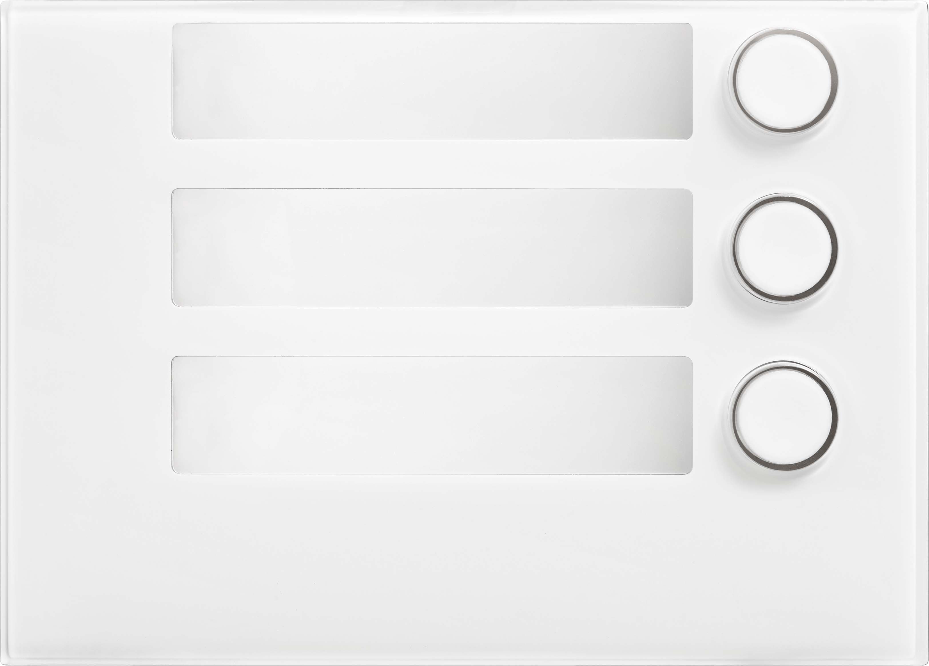 Diese Tastenfeld-Abdeckung besitzt drei Klingeltasten und drei Namensschilder und gehört auf das Tastenfeld-Modul TF 1168/4. Die Anordnung ist einreihig und die Klingeltasten sind rechtsbündig.