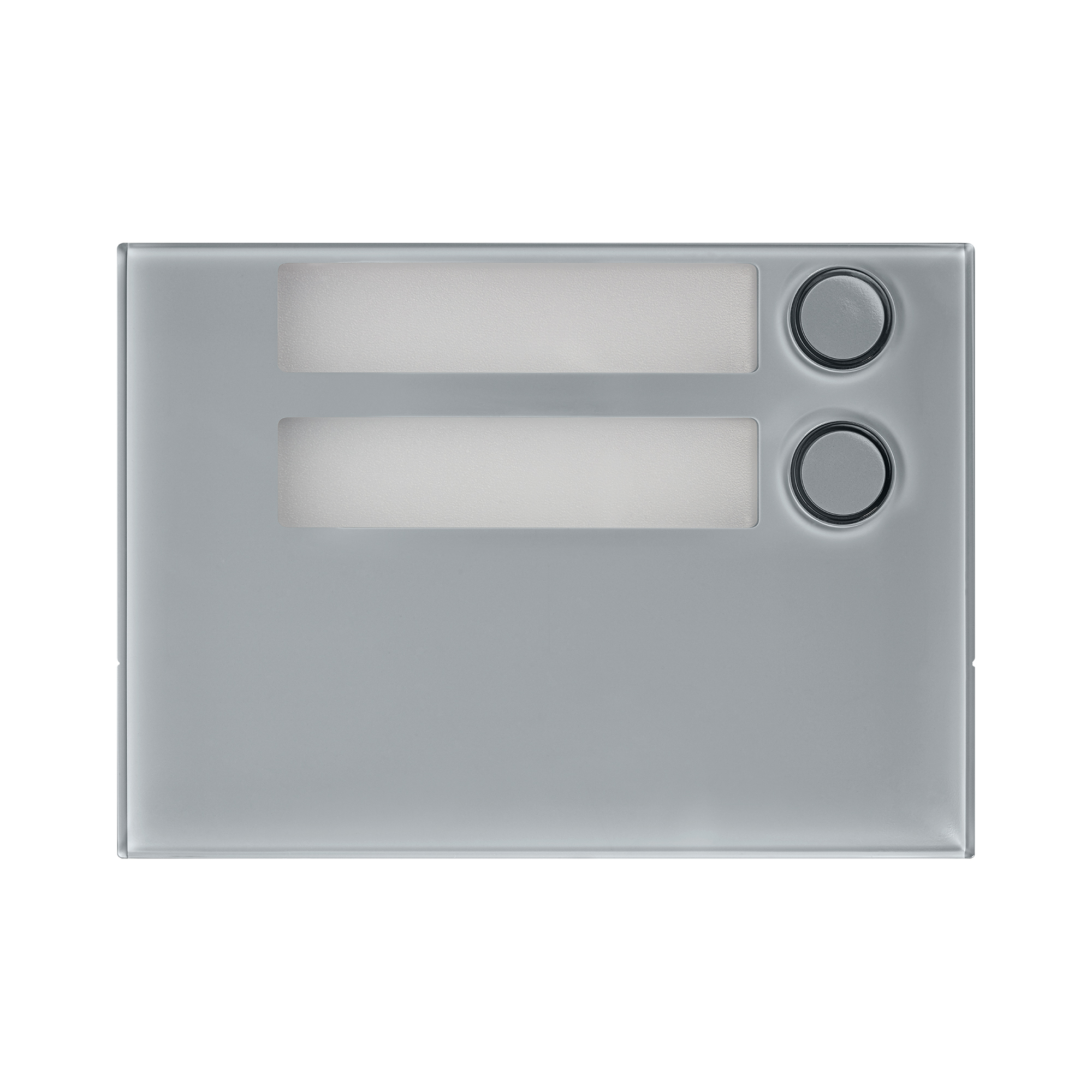 Diese Tastenfeld-Abdeckung besitzt zwei Klingeltasten und zwei Namensschilder und gehört auf das Tastenfeld-Modul TF 1168/4. Die Anordnung ist einreihig und die Klingeltasten sind rechtsbündig.