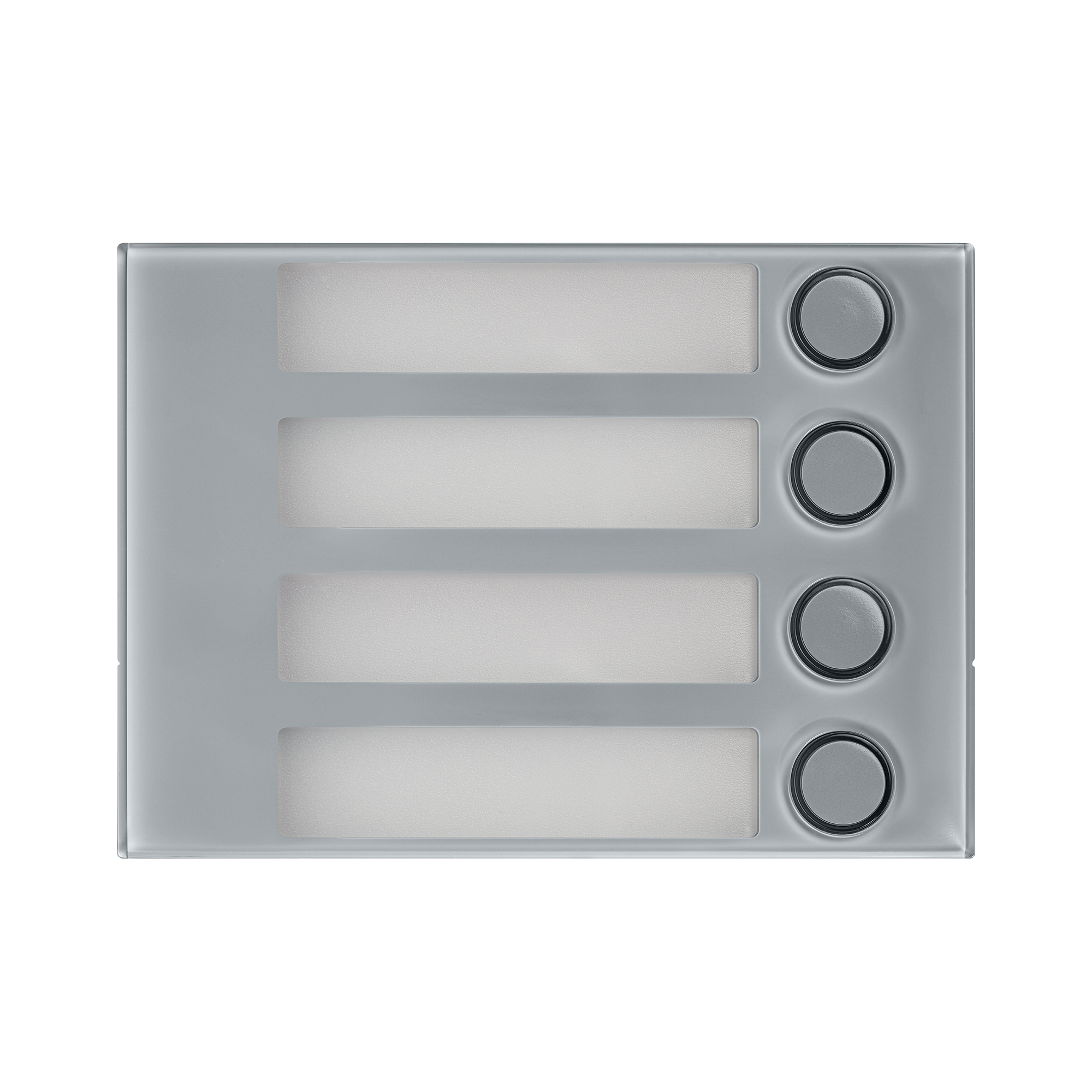 Diese Tastenfeld-Abdeckung besitzt vier Klingeltasten und vier Namensschilder und gehört auf das Tastenfeld-Modul TF 1168/4. Die Anordnung ist einreihig und die Klingeltasten sind rechtsbündig.