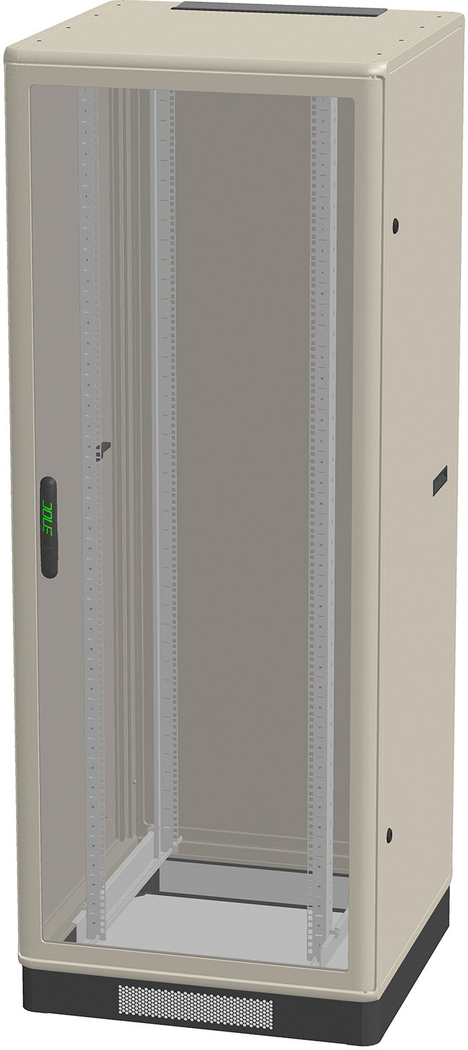 Gesteckte und intelligent verschraubte Aluminiumrahmenkonstruktion mit Eckstücken aus Spritzgusszink. Zwei vertikale Systemnuten pro Aluminiumprofil zur universalen Montage von Zubehör, Grundgestell mit Schrauben TX 25 verschraubt, Vordertür aus 4 mm starkem, rauchfarbigem Sicherheitsglas eingefasst in einem Aluminiumprofilrahmen. Ergonomischer Schwenkhebelgriff LS 85 mit Sicherheitszylinder und Schlüssel, Schnellverschluss, Türöffnungswinkel >180°, Rücktür aus Stahlblech eingefasst in einem Aluminiumprofilrahmen. Schloß LS 37 mit Sicherheitszylinder und Schlüssel, Schnellverschluss, Türöffnungswinkel >180°, Seitenwände aus Stahlblech, einfach abnehmbar und von innen verschließbar mit integrierten Griffmulden für ein besseres Handling, modularer Bodenrahmenaufbau offen mit front- und rückseitiger Systemnut Nachrüstung von Sichtschutzblenden, Filterblechen, Bodenblechpaketen und Sockelpaketen ist möglich, modularer Dachaufbau mit einem Kabeldurchführungsmodul incl. Bürstenleiste hinten und Blindmodulen. Einfacher Austausch gegen Ventilations-, Lüfter- oder weiterer Kabeleinführungsmodule ist möglich. Alle Module können gegeneinander getauscht werden sowie im Maß von 600 x 600 mm oder 800 x 800 mm um 90° gedreht werden. Bestandsinstallationen können problemlos über das U-Förmige Kabeleinführungsmodul nachträglich eingebracht werden, 19 Zoll Befestigungsebene (482,6 mm) mit Lochraster nach IEC 60297-1 und 2, vorne auf 4 multifunktionalen Tiefenstreben 100 mm tief im Schrank montiert. Kennzeichnung der Höheneinheiten (HEs) durchnummeriert und von vorn ablesbar. Stufenlos verstellbar im -Slide modus- über die gesamte Schranktiefe durch lösen eines TX T25/M5 Schnellverschlusses. Alle Tiefenstreben mit gestanztem Maßraster zur schnellen und einfachen Ausrichtung des 19 Zoll Profils. Stufenlos verstellbar nach rechts oder links zur individuellen Anpassung des Montage- und Verkabelungsfreiraumes, Sockel 100 mm montiert mit 2 Blindblechen seitlich sowie 2 Lüftungsblechen vorn und hinten inklusive Filtermatten ENOC System Schwarz RAL 9005, zentraler Erdanschluss über Gewindebolzen M5 am Eckprofil, lose beiliegend bei DE und DE1, 1x ADA 03, Adaptereinsatz für DIN-Profilhalbzylinder, 1x EK X1, Erdungskabelsatz