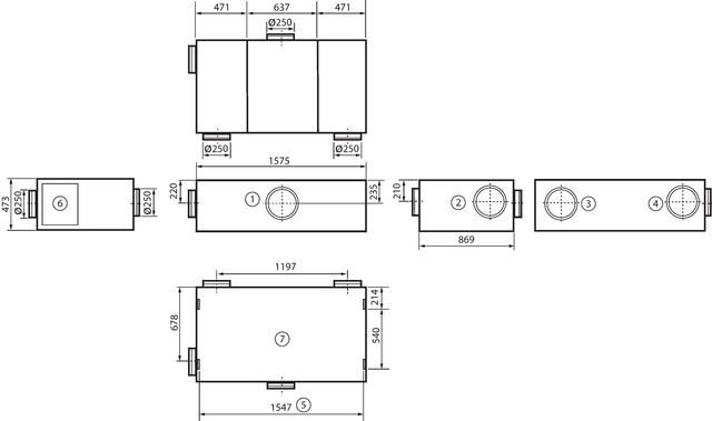 - Mit Enthalpie-Wärmetauscher, Außen- und Fortluftanschlüsse auf der Rückseite, Zu- und Abluft über Kanal, nicht verkleidet.