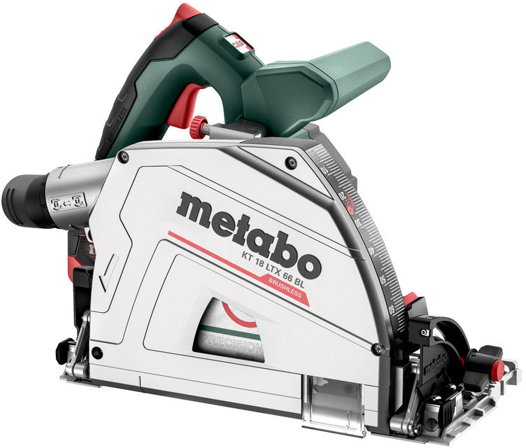 Akku-Tauchkreissäge mit Brushless-Motor für kraftvolles Eintauchen und präzise Sägeschnitte bis 66 mm (!) Tiefe Spielfreier, justierbarer Sitz auf den Führungsschienen von Metabo und anderen Herstellern für exakte Schnittergebnisse LiHD Hochleistungs-Akkupacks und der Metabo Brushless-Motor garantieren maximale Durchzugskraft und ausdauerndes Sägen Vielseitiger Einsatz durch variable Drehzahl für unterschiedliche Materialien Doppelanzeiger für exaktes Einstellen der Schnitttiefe mit und ohne Führungsschiene Mit Hinterschnittfunktion für passgenaue Übergänge, 0°- und 45°-Position nachjustierbar für höchste Schnittgenauigkeit Wandnahes Sägen bis 14 mm möglich Staubarmes Sägen dank dem großvolumigen Staubsack oder durch Anschließen eines Saugers Automatisches Ein-/Ausschalten des angeschlossenen Saugers durch CordlessControl (als Zubehör erhältlich) Sägespäne-Auswurfstutzen für jede Arbeitsposition individuell dreh- und arretierbar Auslaufbremse stoppt das Sägeblatt besonders schnell und erhöht die Sicherheit Sichtfenster in der Schutzhaube für exakte Schnittführung Schnellen und einfaches Wechseln des Sägeblatts durch Hebel für einrastende Tauchposition und Spindelstopp Praktischer Parallelanschlag als Zubehör verfügbar (Bestell-Nr. 628029000) Mit metaBOX, der intelligenten Lösung für Transport und Aufbewahrung Kombinierbar mit allen 18V-Akkupacks und Ladegeräten der CAS Marken: www.cordless-alliance-system.com Lieferumfang Sägeblatt "