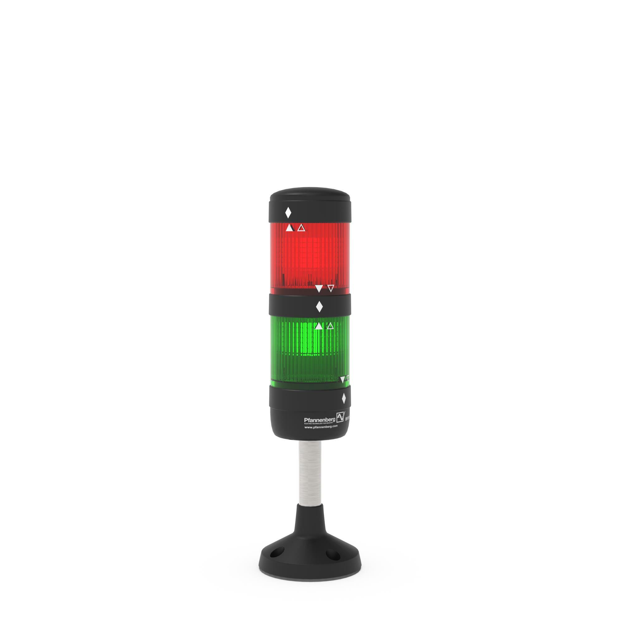 LED Signalsäule 2 stufig (Dauerlicht) komplett konfektioniert und einbaufertig, oben rot, unten grün, inklusive 100 mm Stativ mit Fuß, IP 65 - bis zu 5 Modulen mit 6 Haubenfarben lassen sich einfach durch Zusammenstecken auch nachträglich beliebig kombinieren - Alternative Module sind: LED-Dauerlicht LED-Blinklicht (1,5 Hz) Xenon-Blitzlicht Schallgeber 85 dB (A) - Überall dort anzuwenden, wo Maschinenstände angezeigt und Warnsignale gegeben werden müssen - Modulare Bauweise mit robustem Gehäuse für alle Innen- und Außenanwendungen, bei denen es rau zugeht - flexibles Baukastensystem gewährleistet leichte Handhabung - Mechanik und Elektronik sind entkoppelt, daraus ergibt sich ein stabiler, vibrationsunempfindlicher Aufbau - vielseitige Variationsmöglichkeiten, alternative Befestigung per Stativ-, Rohr- und Direktmontage möglich - Option: Überwachte Module für mehr Sicherheit, aufgebaut mit Leuchtmitteln aus 2 separaten LED-Strängen. Bei Ausfall von einem Strang wird der Alarmkontakt aktiviert und der zweite Strang leuchtet weiter - hohe Schutzart IP 65 - Maße: Ø 54 x 63 mm pro Leucht-Modul