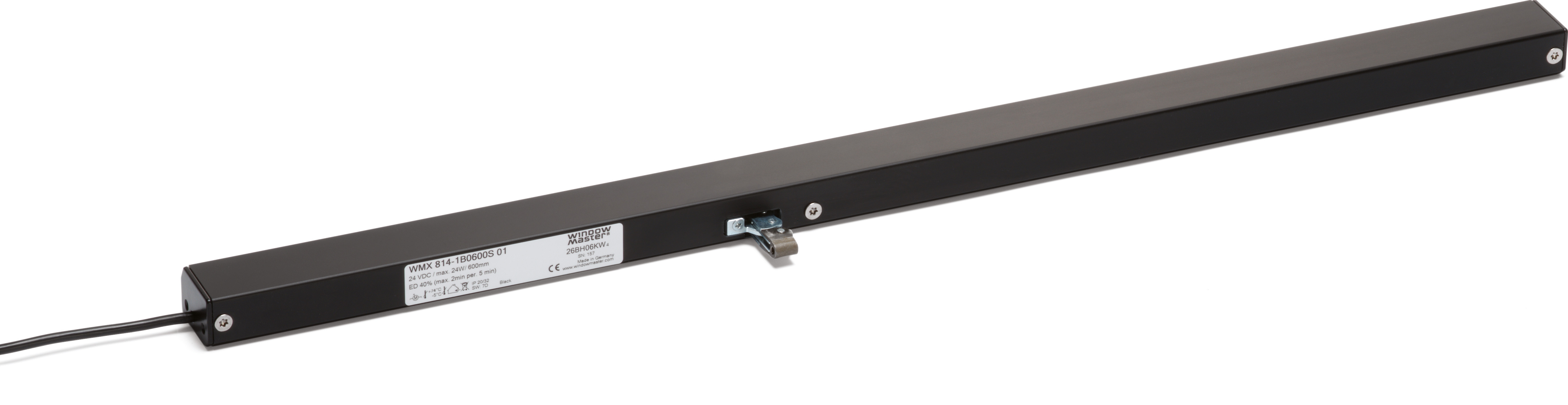 Programmierbarer 24V DC Kettenantrieb für die aufgesetzte Montage für RWA und die Komfortlüftung. Anwendungsbereich: Ansteuerung über ±24V-Steuereinheiten oder Bus-fähige MotorController mit MotorLink®-Technologie, kann mit einem WMB Verriegelungsantrieb gekoppelt werden, Synchonisierung von bis zu 4 Fensterantrieben, kein externes Synchronisierungsmodul notwendig, exakte digitale Positionsrückmeldung sowie mögliche, Programmierung von 3 verschiedenen Geschwindigkeiten in Verbindung mit MotorLink®-Steuerungen, Soft Close-Funktion, eine Umprogrammierung von Druckkraft, Geschwindigkeit und Reversierung kann jederzeit mit dem WindowMaster Programmiergerät WAT 100 vorgenommen werden, eingebaute elektronische Lastabschaltung/Endabschaltung, Motorelektronik mit Mikrocontroller, der Antrieb reversiert zur Idealposition des Fensters um die Lebenszeit der Fensterdichtung zu erhöhen, einfache Montage, es gibt vier Varianten von dem Antrieb: Singleantrieb (-1), Synchroantrieb (-2), Trialantrieb (-3) und Quattroantrieb (-4), die Synchroantriebe (-2, -3 und -4) haben eine eingebaute patentierte Synchronisationsfunktion, die sichert, dass die Antriebe ohne zusätzliche Module direkt miteinander kommunizieren können und selbst Geschwindigkeit und Position aufeinander abstimmen, an größeren Fenstern können bis zu 4 Antriebe ohne zusätzliches Synchronisationsmodul installiert werden, der Antrieb ist so progammiert, dass er beim Widerstand während des Schließens anhält und umkehrt, Antriebe die an ±24 VDC Steuereinheiten (z.B. WUC) angeschlossen sind, Antriebe die an Steuereinheiten mit MotorLink® angeschlossen sind (z.B. WSC xxM) verfügen über drei unterschiedliche Geschwindigkeiten: automatische gesteuerte Geschwindigkeit die Antriebe fahren langsam und fast lautlos, manuelle gesteuerte Geschwindigkeit die Antriebe fahren schneller und hörbar, RWA und Sicherheit gesteuerte Geschwindigkeit die Antriebe fahren am schnellsten, RWA-Geschwindigkeit haben immer Vorrang. Lieferumfang: WMX 814 E1: Antrieb mit 5m Kabel (5-Adern 0,34 mm²) mit Klemmschutzleisteanschluss und Fast-in/ Fast-on Anschlusskabel für WLL-Zuleitung.